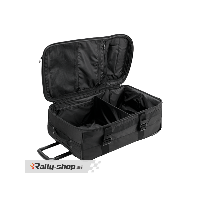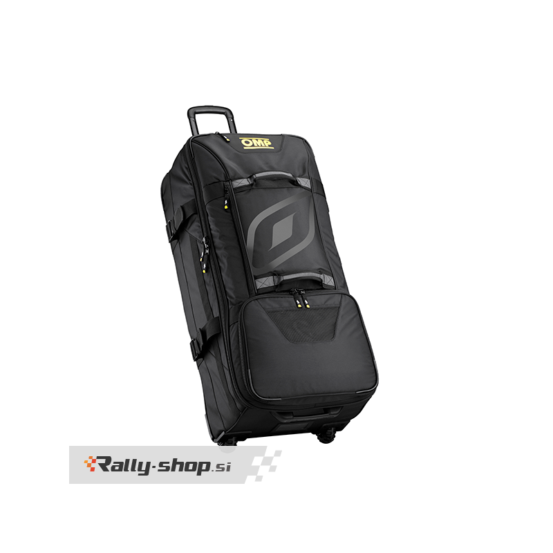 OMP Large Trolley - Lightweight and durable fabric - Double closure with padlock-ready zipper - Resistant cargo wheels - Double handle on front and practical upper handle - Multiple internal storage compartments - Removable padded divider to store helmet or anything else - Rigid bottom with standing support - Coverable air net insert - Racing suit-inspired design insert Dimensions: 42 x 36 x 92 cm Capacity: 145LT